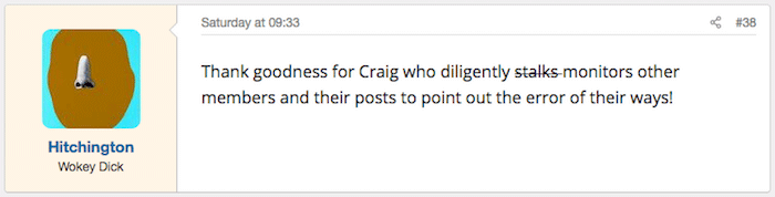 A POTD to Craig on a thread called 'Morons' is peak NACF, which is to say, I've never been afraid to go there. "Go where?" ask morons if I was plebeian enough to call people morons. Though I do have a list.